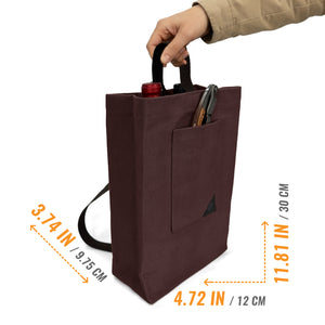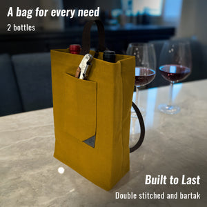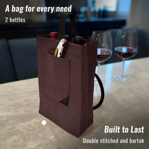 SACOLA PREMIUM DE LONA PARA VINHO - Nossa sacola é construída com material durável e costura reforçada para uso prolongado. As medidas (L x P x A) são: para 1 garrafa 12 x 9,5 x 30 cm; e para 2 garrafas 21 x 9,5 x 30 cm, incluindo uma divisória interna para manter as garrafas separadas. As bolsas se ajustam à maioria das garrafas padrão de 750 ml de vinho, champanhe, licor e outras bebidas destiladas.