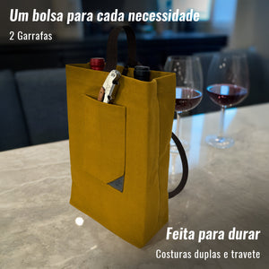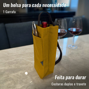 SACOLA PREMIUM DE LONA PARA VINHO - Nossa sacola é construída com material durável e costura reforçada para uso prolongado. As medidas (L x P x A) são: para 1 garrafa 12 x 9,5 x 30 cm; e para 2 garrafas 21 x 9,5 x 30 cm, incluindo uma divisória interna para manter as garrafas separadas. As bolsas se ajustam à maioria das garrafas padrão de 750 ml de vinho, champanhe, licor e outras bebidas destiladas.
