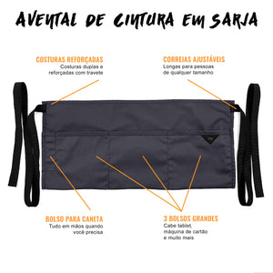 - 3 Bolsos Espaçosos para Garçons e Garçonetes - cabe tablet, celular, bloco de notas, talão de pedido, porta conta e comanda, além de carteira.